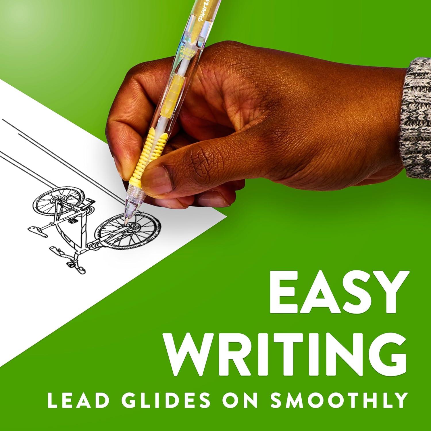 Experience break resistant lead that glides on smoothly with Paper Mate Clearpoint mechanical pencils! Featuring a convenient side-click advance mechanism on the barrel, you’ll be able to load your pencil lead without losing your grasp or slowing down. The textured grip provides comfort and control during long writing sessions, while the jumbo twist-up eraser lets you easily correct mistakes without any smudges or tearing. As a bonus, this collection of #2 pencils features bright new colors in a fun Color Block design to add a blast of joy to your writing. With the feel of a pen and the performance of a pencil, Paper Mate Clearpoint pencils are great for a variety of writing and art uses!